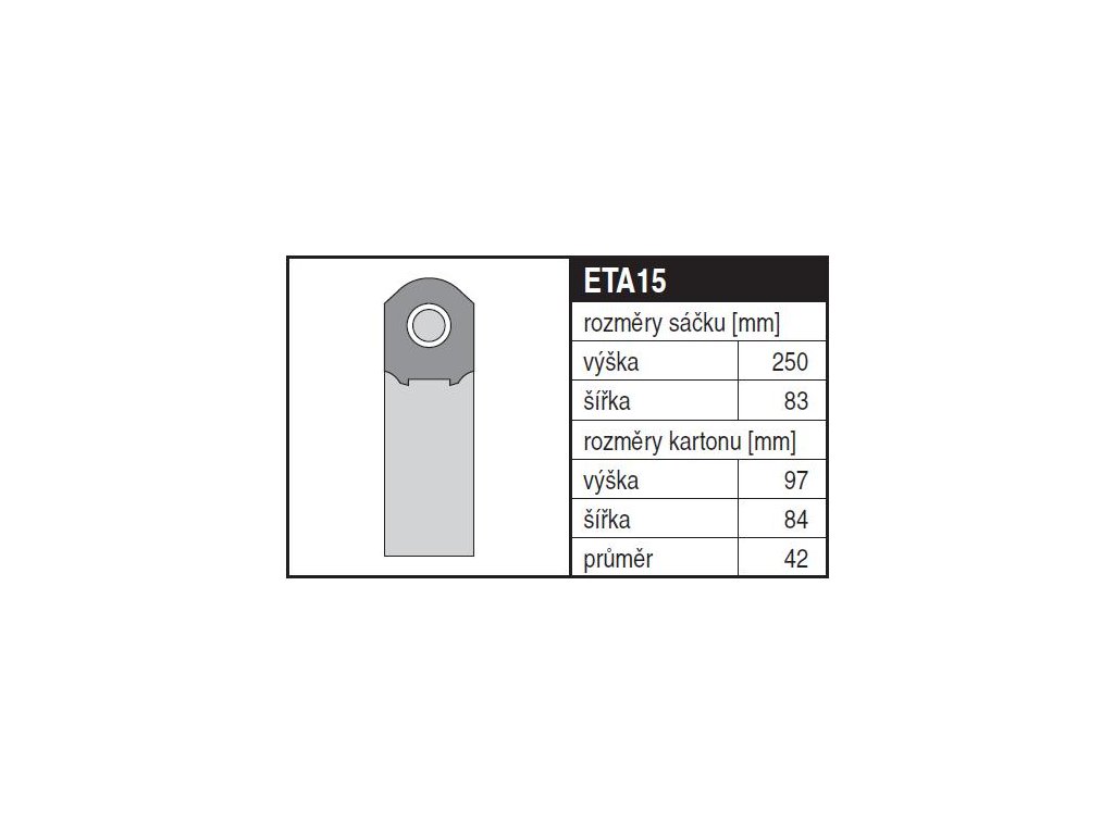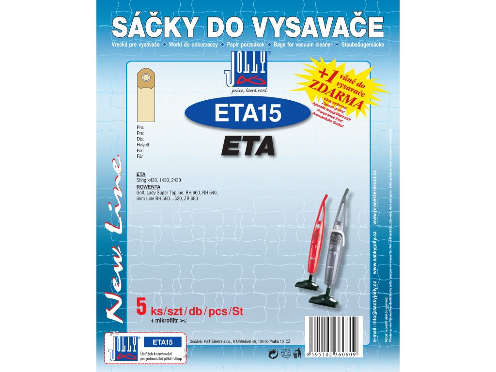 Papírové sáčky do vysavače ETA15. Balení obsahuje 5 ks papírových sáčků ETA15, vůni do vysavače zdarma, která krasně provoní Váš byt, mikrofiltr pro Váš vysavač.