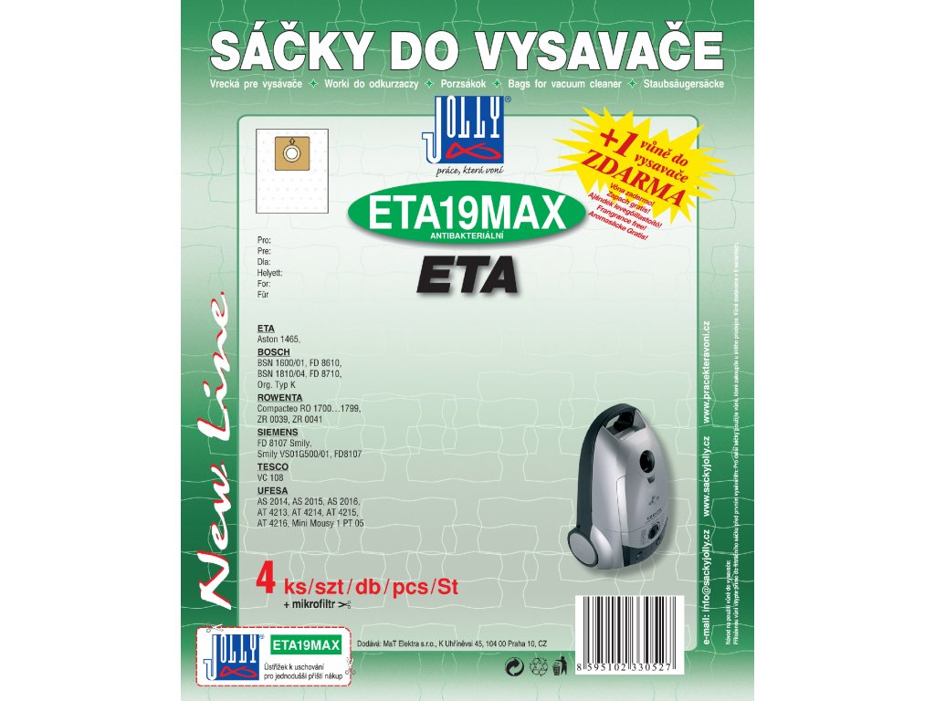 Sáčky do vysavače z netkané textilie ETA19 MAX. Balení obsahuje 4 ks textilních sáčků ETA19 MAX, vůni do vysavače zdarma, která krásně provoní Váš byt, mikrofiltr pro Váš vysavač.