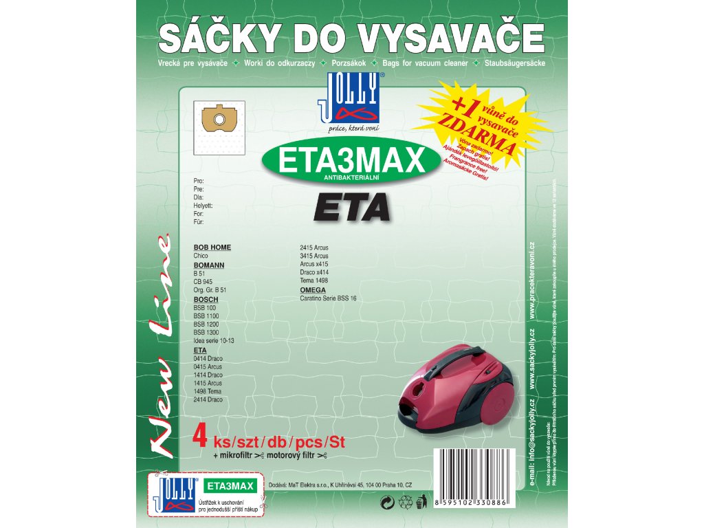 Sáčky do vysavače z netkané textilie ETA3 MAX. Balení obsahuje 4 ks textilních sáčků ETA3 MAX, vůni do vysavače zdarma, která krásně provoní Váš byt, mikrofiltr a motorový filtr pro Váš vysavač.