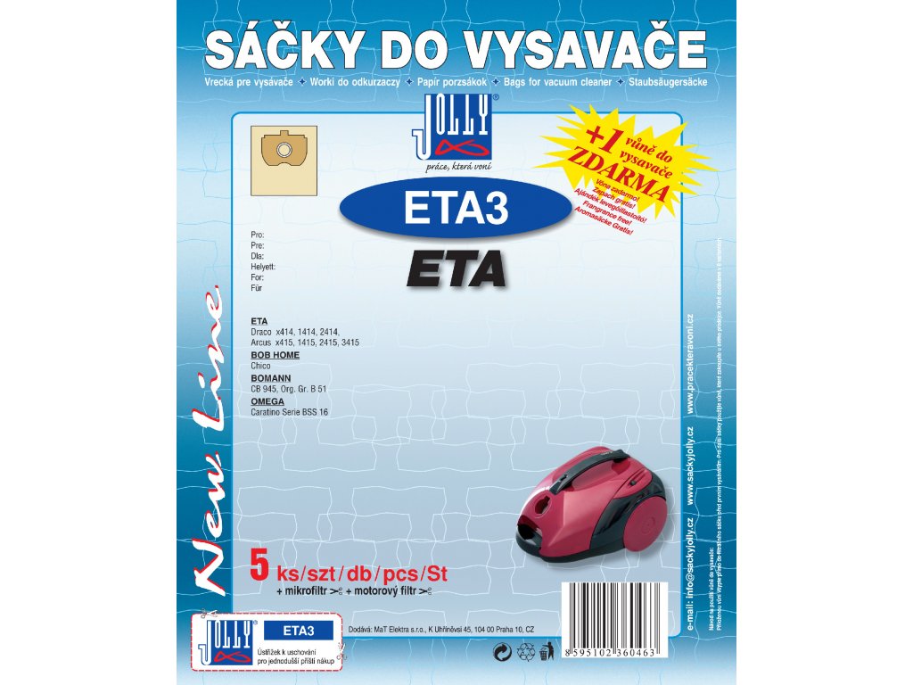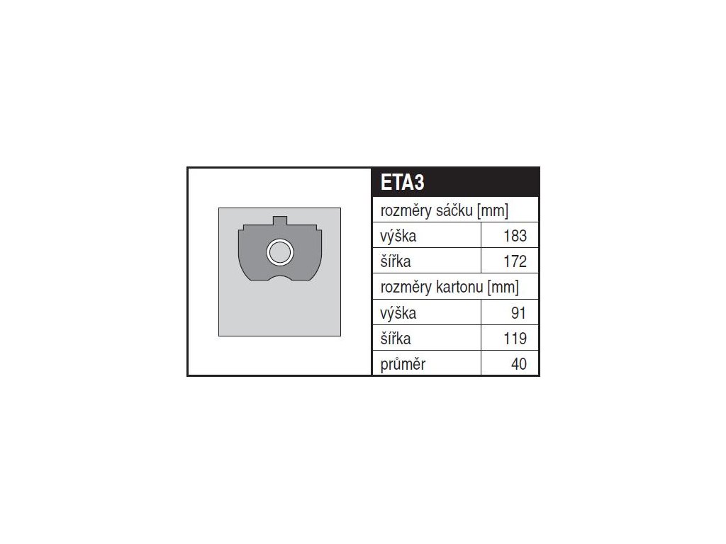 Papírové sáčky do vysavače ETA3. Balení obsahuje 5 ks papírových sáčků ETA3, vůni do vysavače zdarma, která krasně provoní Váš byt, mikrofiltr a motorový filtr pro Váš vysavač.