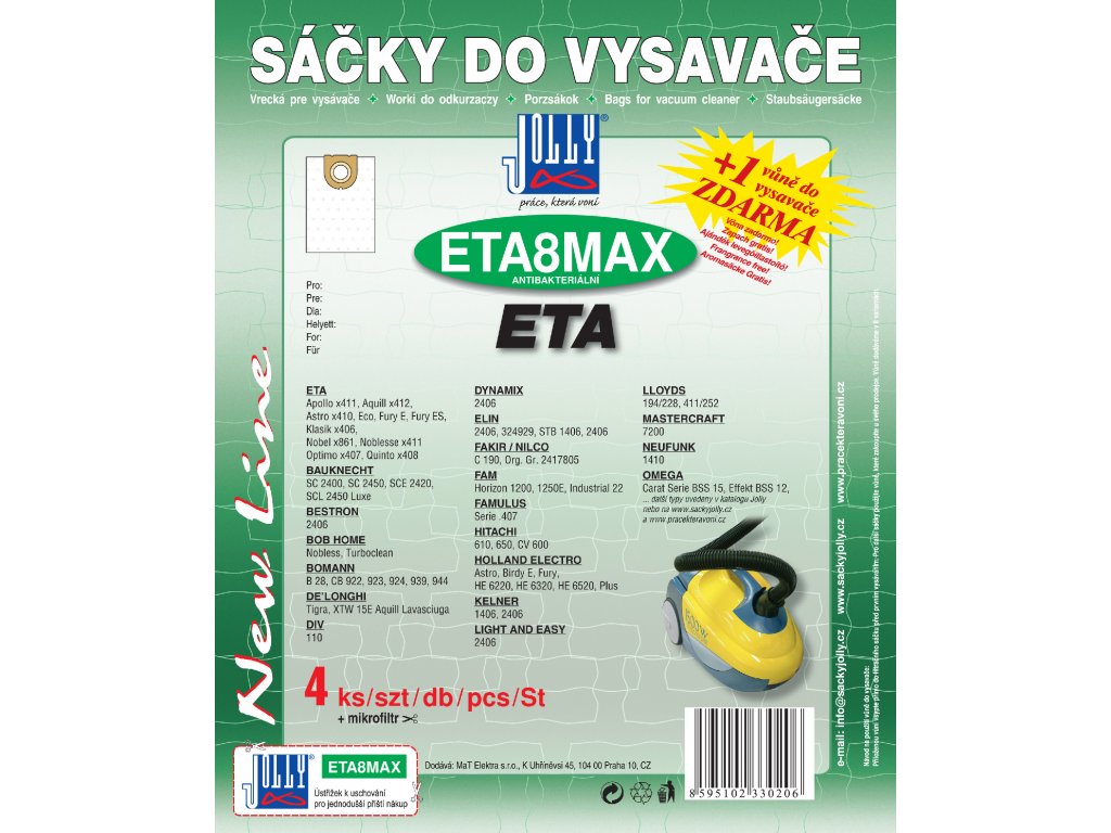 Sáčky do vysavače z netkané textilie ETA8 MAX. Balení obsahuje 4 ks textilních sáčků ETA8 MAX, vůni do vysavače zdarma, která krásně provoní Váš byt, mikrofiltr a motorový filtr pro Váš vysavač.
