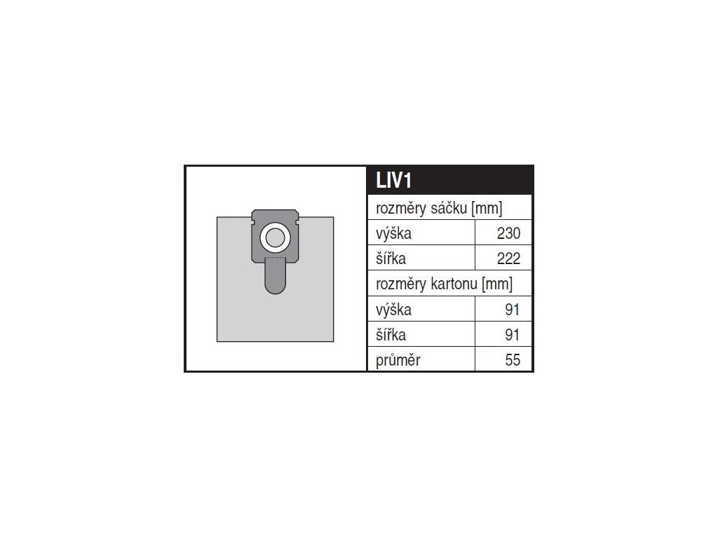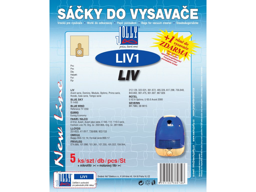 Papírové sáčky do vysavače LIV1. Balení obsahuje 5 ks papírových sáčků LIV1, vůni do vysavače zdarma, která krasně provoní Váš byt, mikrofiltr a motorový filtr pro Váš vysavač.