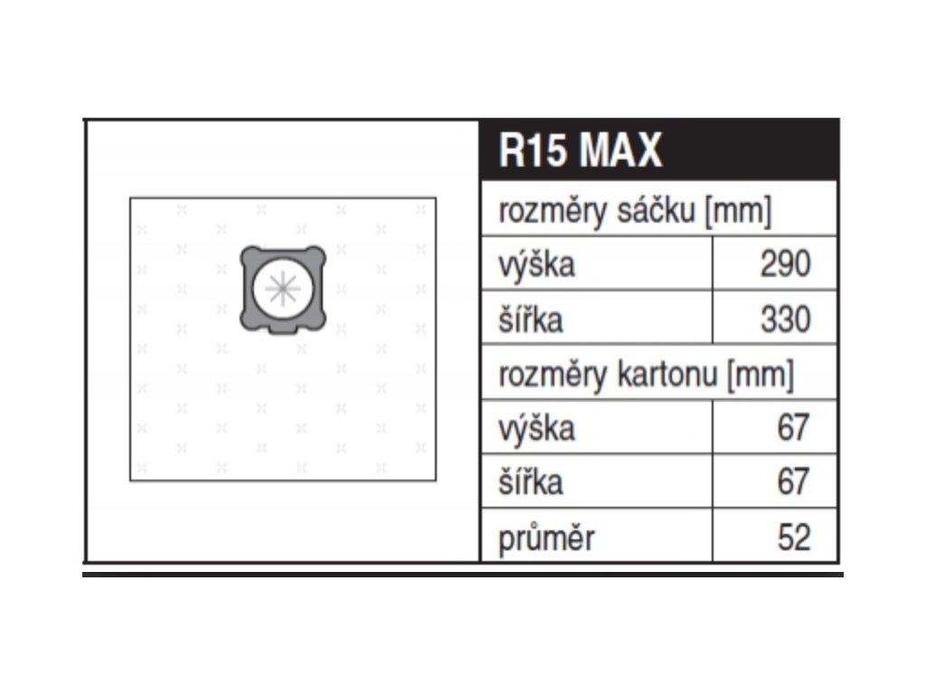 Sáčky do vysavače z netkané textilie R15 MAX. Balení obsahuje 4 ks textilních sáčků R15 MAX, vůni do vysavače zdarma, která krásně provoní Váš byt.