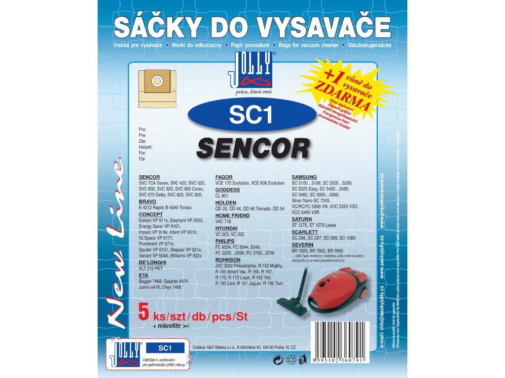 Papírové sáčky do vysavače SC1. Balení obsahuje 5 ks papírových sáčků SC1, vůni do vysavače zdarma, která krasně provoní Váš byt, mikrofiltr pro Váš vysavač.
