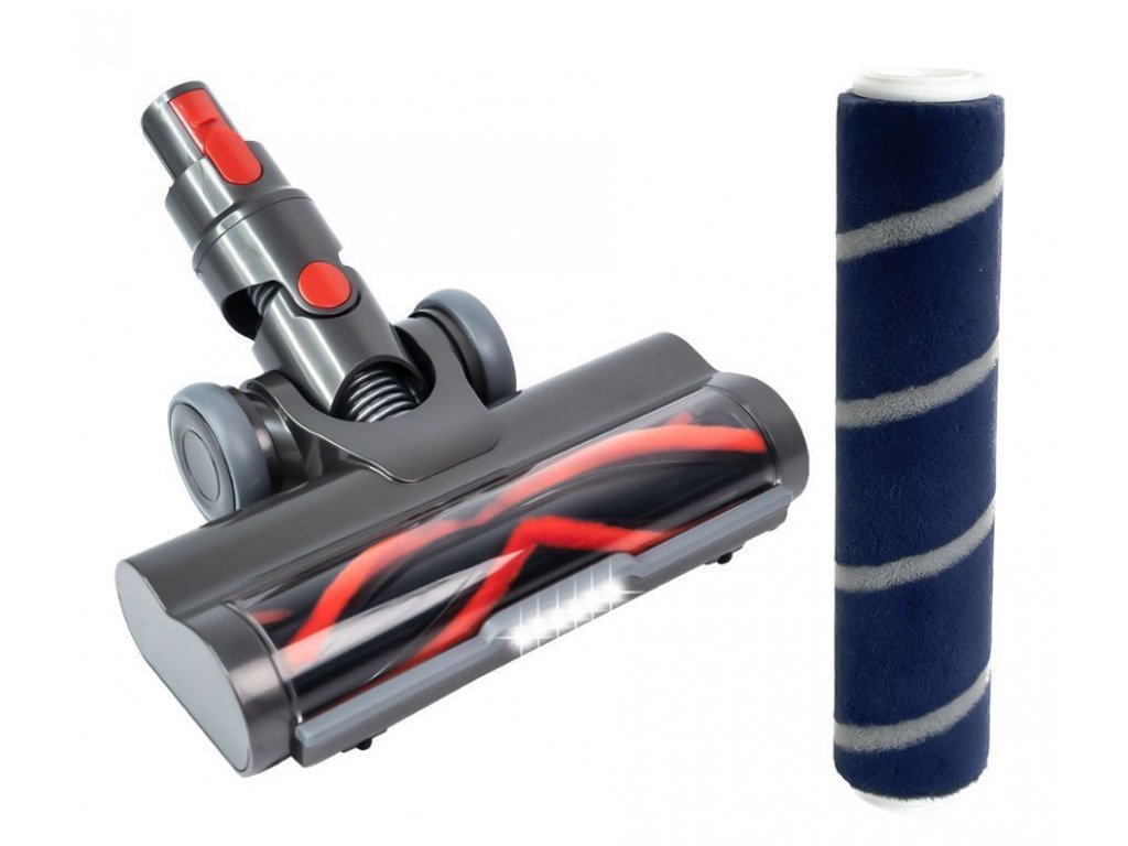Rotační motorizovaná hubice pro vysavače DYSON V7, DYSON V8, DYSON V10, DYSON V11, DYSON V15 s měkkým válcem na tvrdé podlahy jako jsou laminátové podlahy, dřevěné plovoucí podlahy, PVC linoleum, parkety, dlaždice a s rotačním kartáčem se štětinami na koberce. Rotační kartáč se štětinami je určený pro vysávání koberců od nití, vlasů a srsti od domácích mazlíčků.